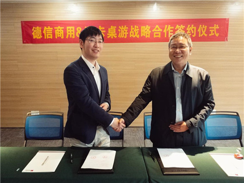 2018年4月24日,浙江德信商用投资管理有限公司(德信商用)与杭州游卡网络技术有限公司(游卡桌游)战略合作签约仪式于杭州隆重举行!德信商用董事长胡斌、总经理鲍寓海,游卡桌游创始人杜彬、副总应晓天等人出席了仪式。