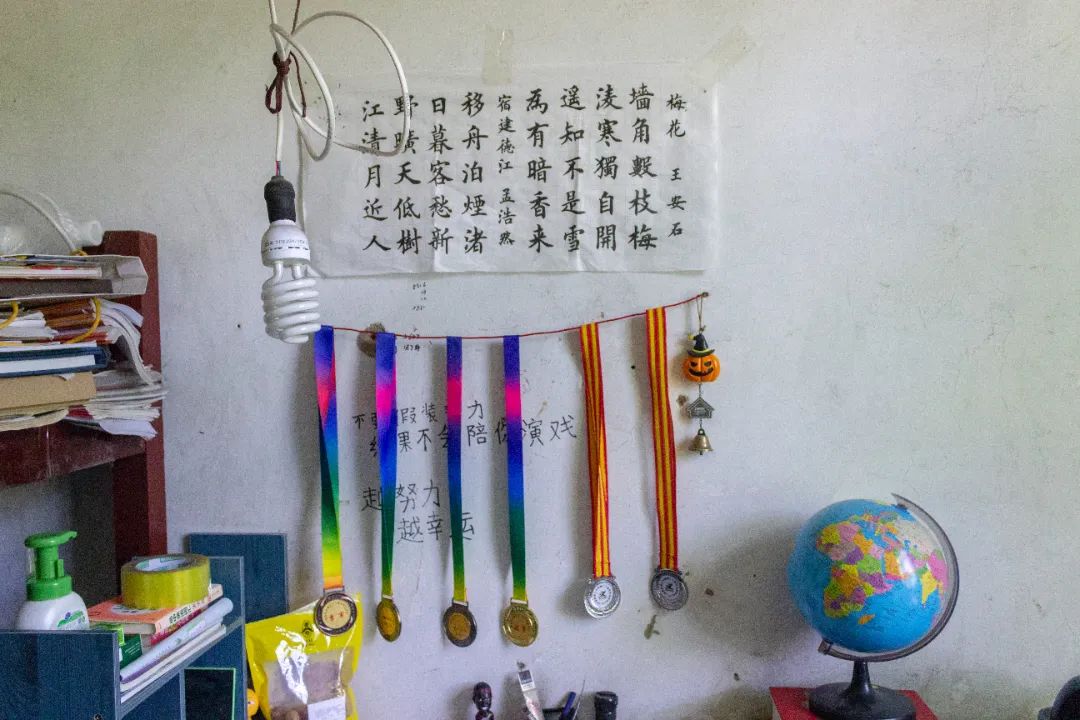 上中学后,学习压力大,罗序浩的情绪也有波动。焦虑的时候,他就靠写字和跑步来平复心绪。书桌前的白墙上贴着他写的两幅书法作品,罗序浩说:“以前练习写楷书,现在喜欢行书,因为更潇洒一些。”墙上还拉了一条绳子,挂满了他跑步获得的奖牌:“这是初三跑800米的亚军、高一800米季军、高一1500米冠军,我还跑过两场6.6公里的校园马拉松……”