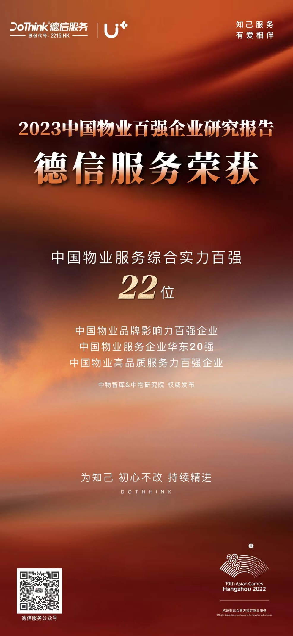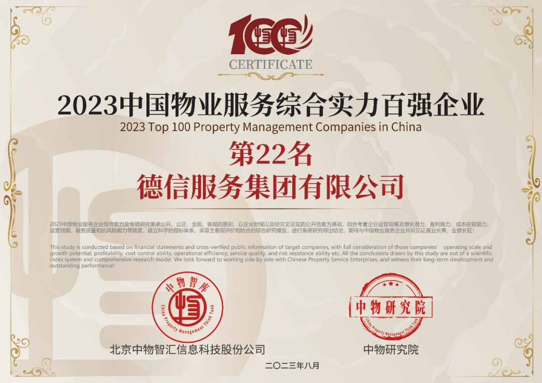 德信服务,凭借高品质的服务实力入选中国物业服务综合实力百强,位列第22位。